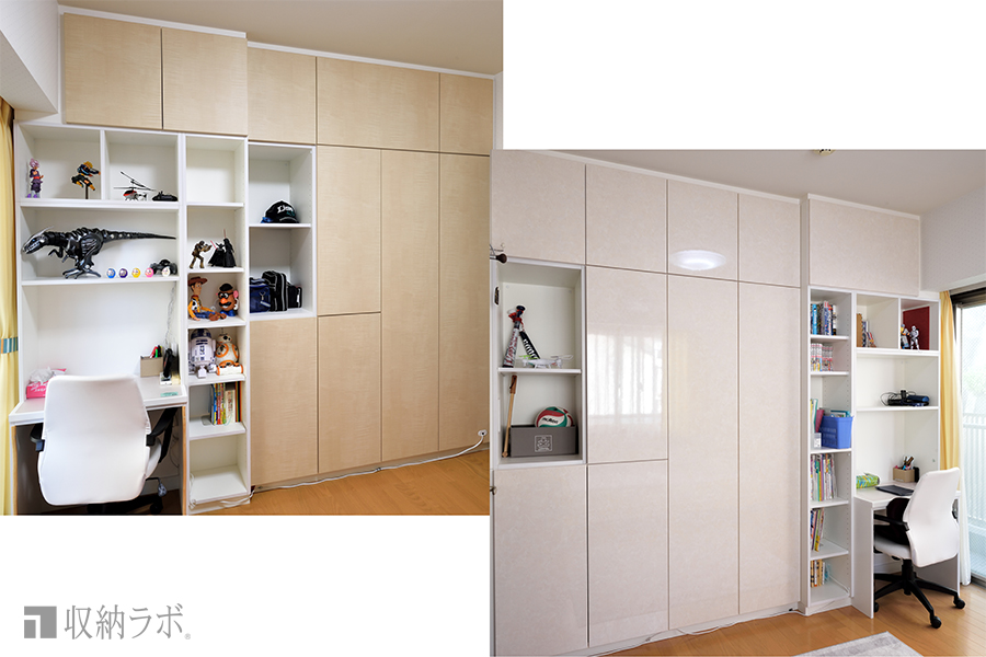 オーダーメイドの壁面収納で、兄弟それぞれの個性を反映させた子ども部屋が完成。