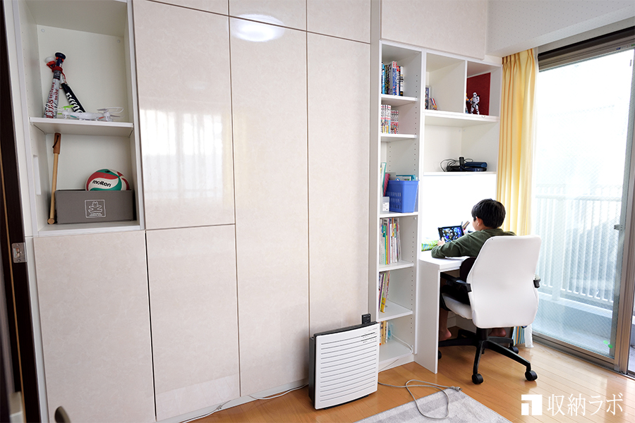両側から使える壁面収納を子ども部屋の間仕切りに。