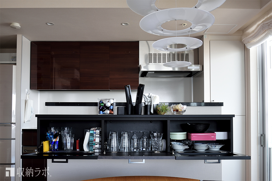 御影石のカウンターで統一した食器棚