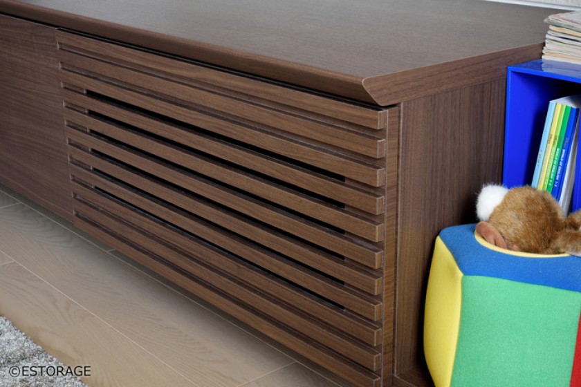 TVボードはルーバー扉や引き出しを扉内部に付けることによって、スッキリとしたデザインのオーダー家具に仕上がりました。