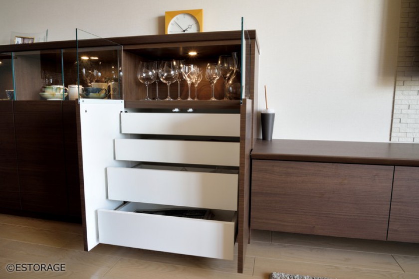 サイドボードはダイニングテーブルに座ると、ちょうど良く見える位置に飾れる収納スペースを設け、下には引き出しや可動式の棚もたくさん入っているので、収納も充実しています。