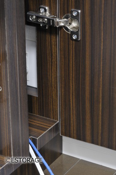 右側の壁にコンセントがあったのですが、家具に組み込み配線経路を確保したので、扉を閉めたままでも使えるようになりました。