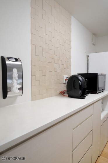 カウンターの上には玄関と同じエコカラットを貼り、良いアクセントになっています。