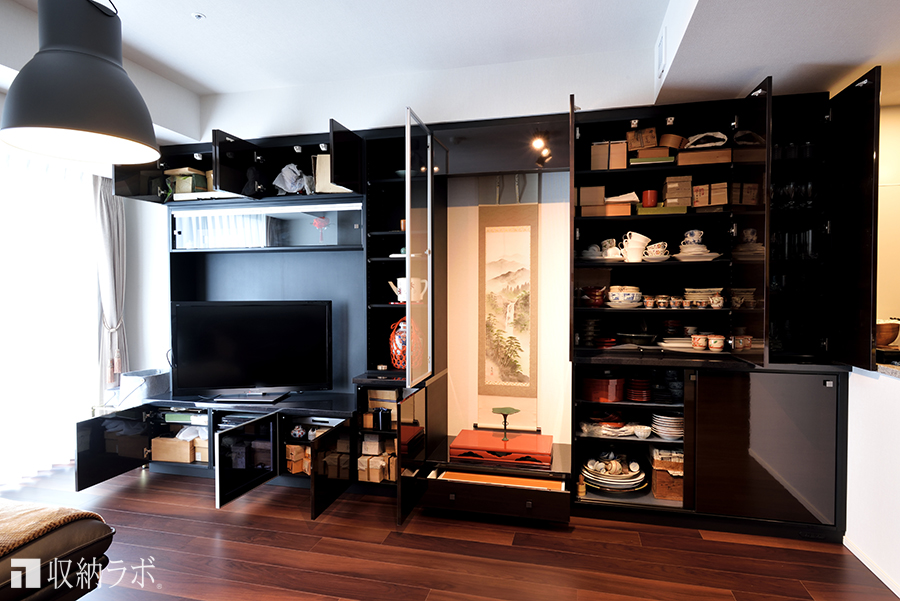 新築マンションのリビングに壁面収納が欲しいと思って情報収集をしていたところ、ネット検索で収納ラボのことを知りました。収納ラボのショールームが、マンションから近い、“みなとみらい”にあったため気軽にショールームを訪ねてみました。昔から持っていた茶道の道具などを収納したいと相談すると、すてきな提案をしていただけました。