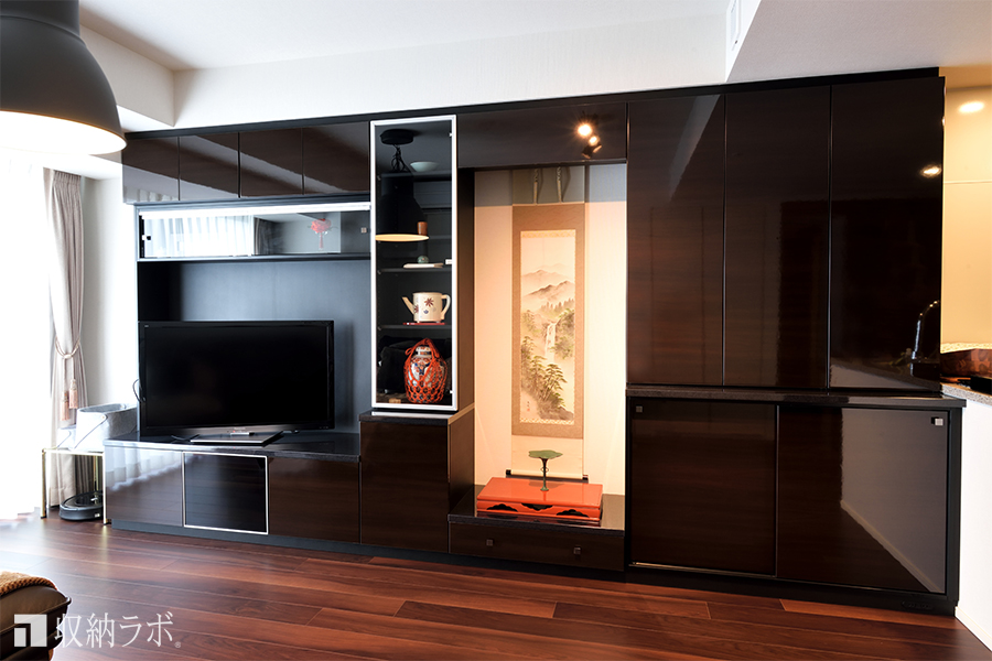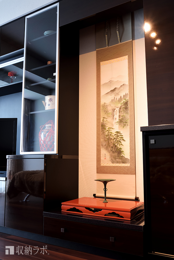 昔から大切にされていた茶道の道具や茶器、掛け軸を収納するだけでなく、飾って楽しめる壁面収納をご提案しました。ただしマンションのリビングなので、和風になりすぎずに和モダンな雰囲気にまとまるように気を使いました。飾り棚の中には照明を組み込むプランもありますが、今回はあえて照明を入れませんでした。ショーケースのように明るくキラキラしすぎるのを避ける事で、上品な和風テイストを残したかったからです。
