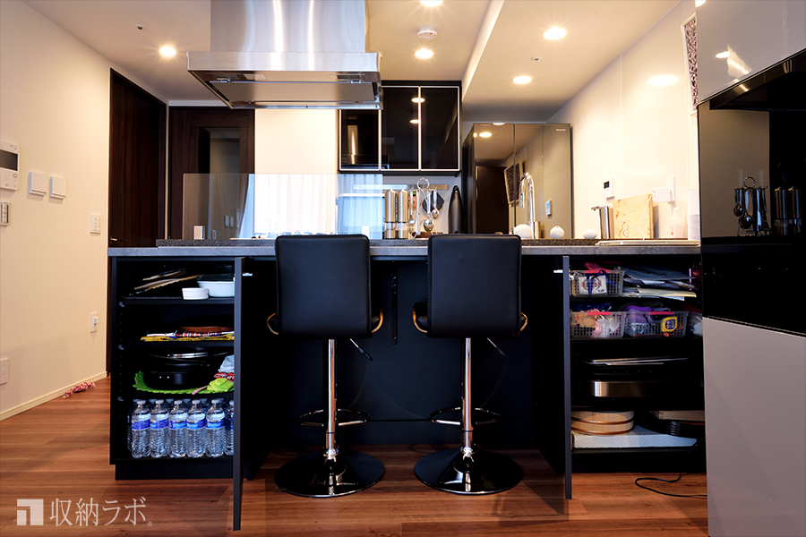 キッチンカウンターには2席分のテーブルスペースと左右に収納ボックスを設けています。キッチンから、カウンターに出来上がった料理を置くことも出来ますし、料理をしながらおしゃべりしたり、カウンターで二人でお茶したり、食事を取るスペースが出来てキッチンが快適な空間になりました。左右に作った収納ボックスは、日常的に使う物を収納することが出来て便利です。