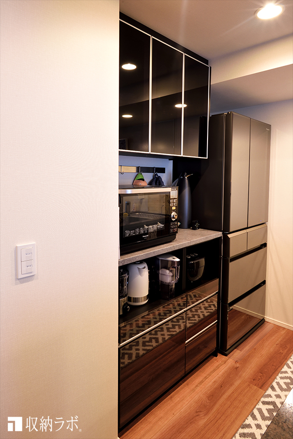 入居予定の新築マンションについて、マンション側から提案されたオプションの食器棚には満足していませんでした。母が『収納ラボ』で、壁面収納をオーダーメイドするため、打ち合わせに付き添った事がきっかけで、私もキッチンカウンターと食器棚をオーダーメイドすることにしました。