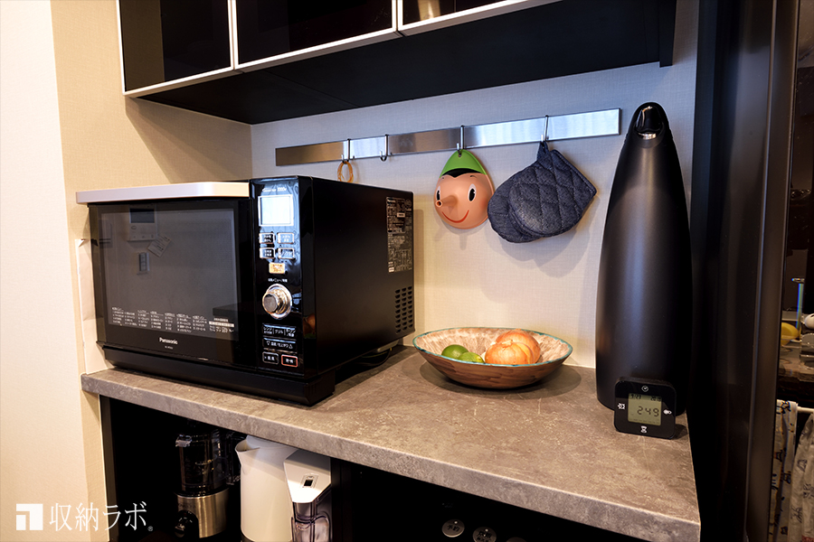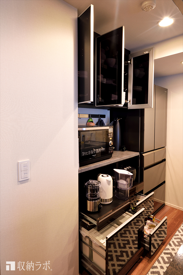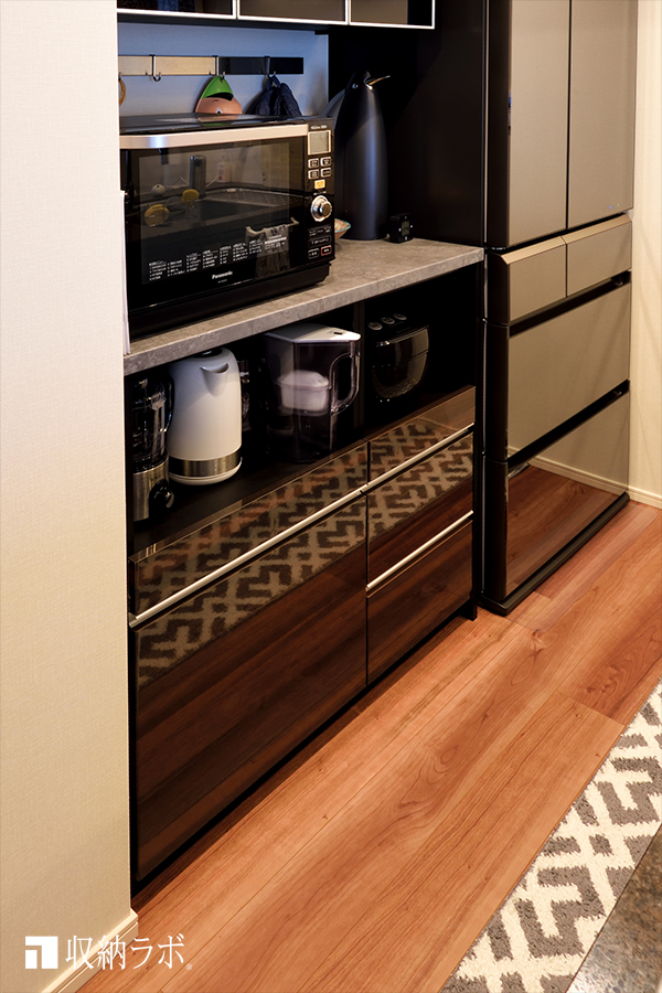 キッチン周りの調理家電などはスライド棚で、必要な時には引き出して使えるようにしました。カウンターの上に家電を並べる必要がなくなったので、調理のためのスペースを確保することが出来ました。