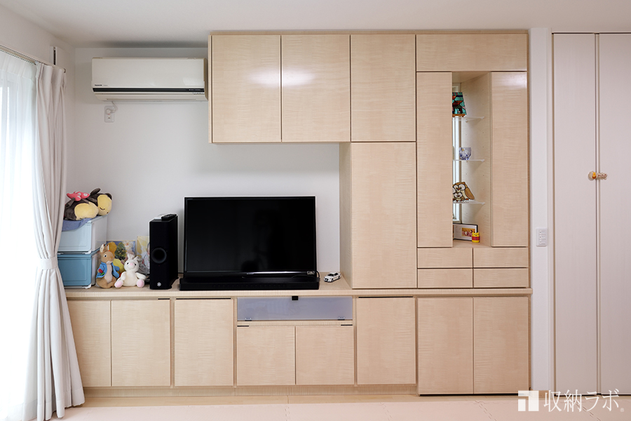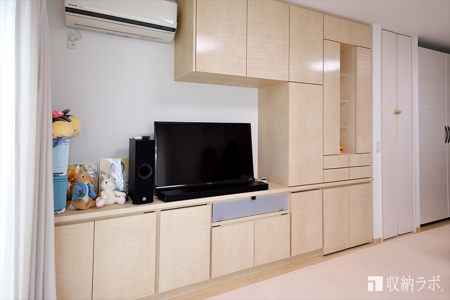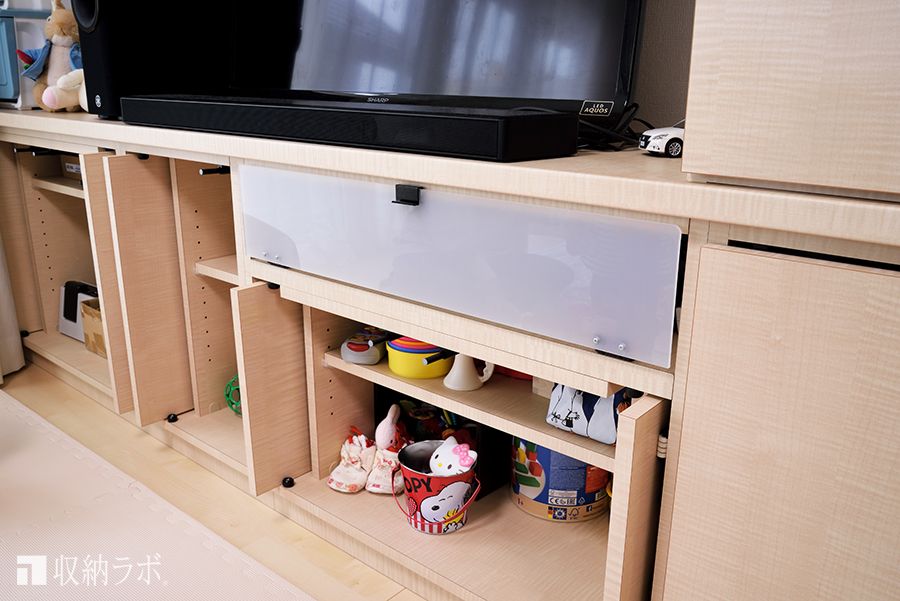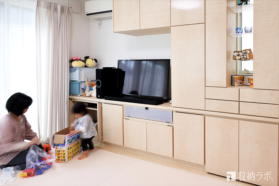 子どものおもちゃを収納する場所は、子どもが自分で出し入れしやすい低い位置にしたいと考えていました。子どもが自分で出し入れしやすい位置におもちゃの収納場所が出来たことで、自分でおかたづけをすることを覚えてくれました。収納場所を決めることが、子どものしつけにも役に立つとは驚きました。