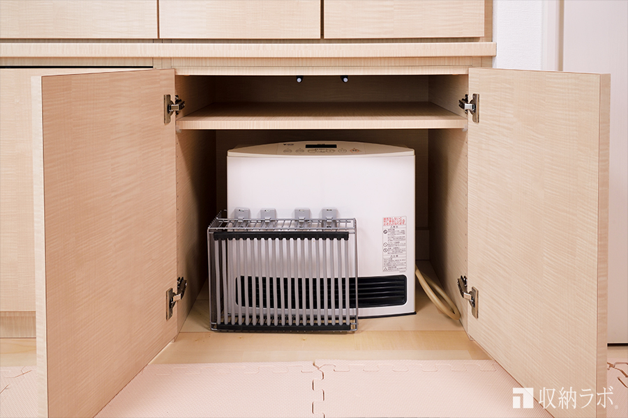 プランしていただいた、壁面収納はガス栓の位置にガスファンヒーターを収納するスペースが設計されていました。これで、冬にはガスファンヒーターを引き出して使えて、使わない季節には扉を締めれば収納しておけます。これで、重たいガスファンヒーターを季節のたびに移動させる必要もなくて快適です。