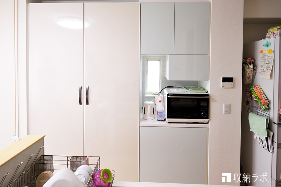 扉を閉めれば、食器も炊飯器も隠せてしまうので、家事が済んだらスッキリ片付けられます。