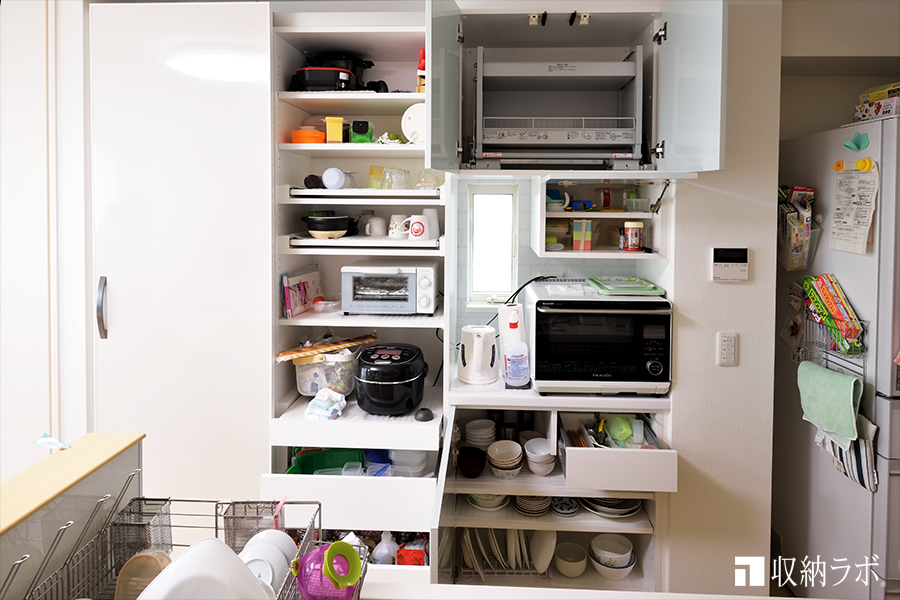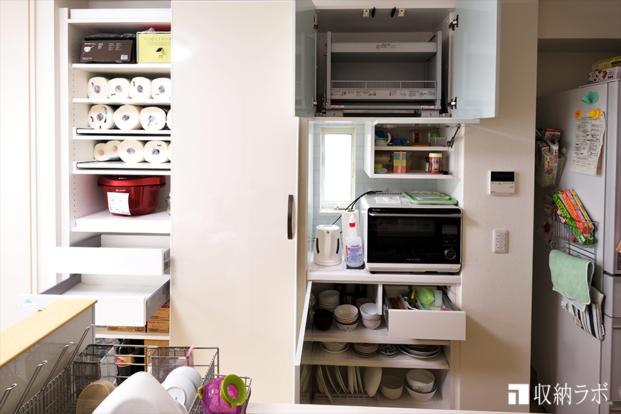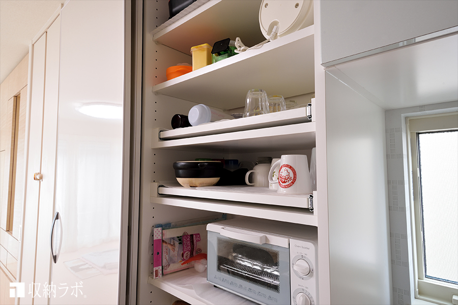 また、日ごろからよく使う食器類は、スライド棚に収納しています。食器棚に重ねて収納している食器を使うたびに、出し入れする事とくらべると、食器類の出し入れがとてもスムーズになりました。食器以外にも炊飯器も同じようにスライド棚を使って収納しています。