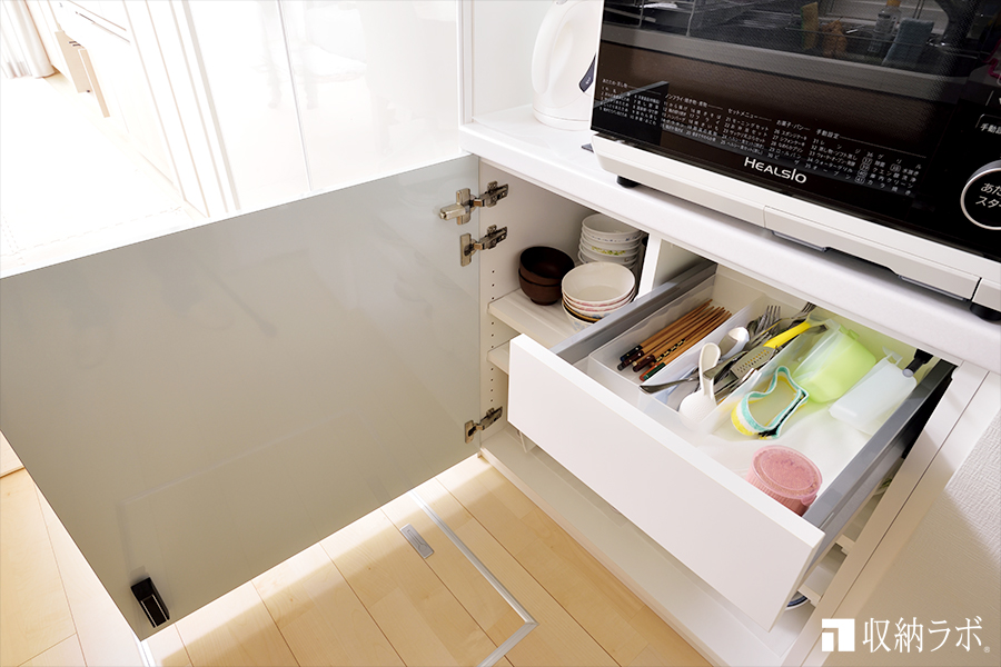 さらに一工夫してもらったことは、下段の収納ボックス扉の内側に取り付けたドアストッパーです。料理をしている時に、下段の扉を開けたままストッパーで固定しておくと、扉がちょうど柵代わりになって、子どもがガスレンジ台のまわりに近づけなくなります。