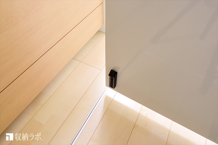 ショールームを訪れた時には、さまざまな収納家具の機能や工夫を体験することができました。まず、気に入ったのは、フラット引き戸でした。一般的な引き戸と違って、扉を閉じた状態は段差がなくフラットになるため、スッキリとした印象が気に入りました。これならキッチンで家事をしている間、扉を開けたままでも、キッチンとリビングの行き来がスムーズになって便利です。