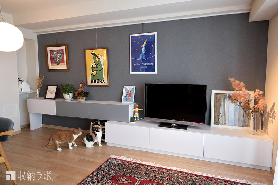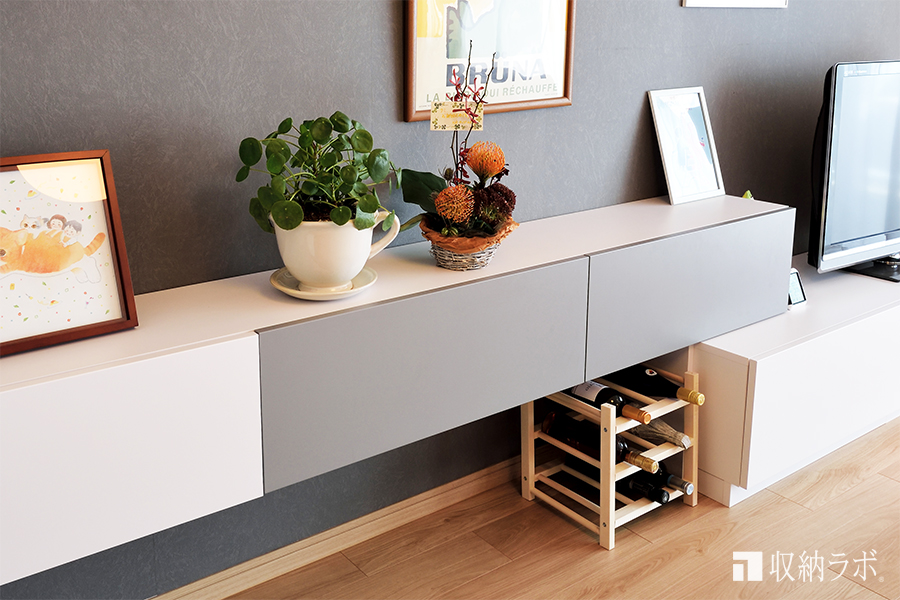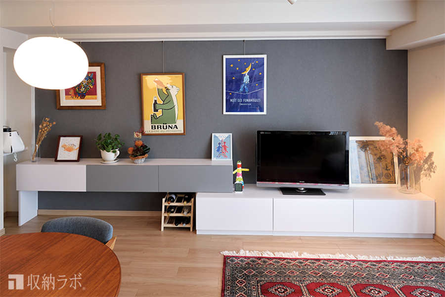 もともとはテレビボードを置くご予定だったところ、収納ラボでオーダーすることになった壁面収納のテイストに合わせて、ダイニング収納もご検討いただけたので、壁面収納と合わせて、趣味やライフスタイルを考慮した上でプランをご提案しました。