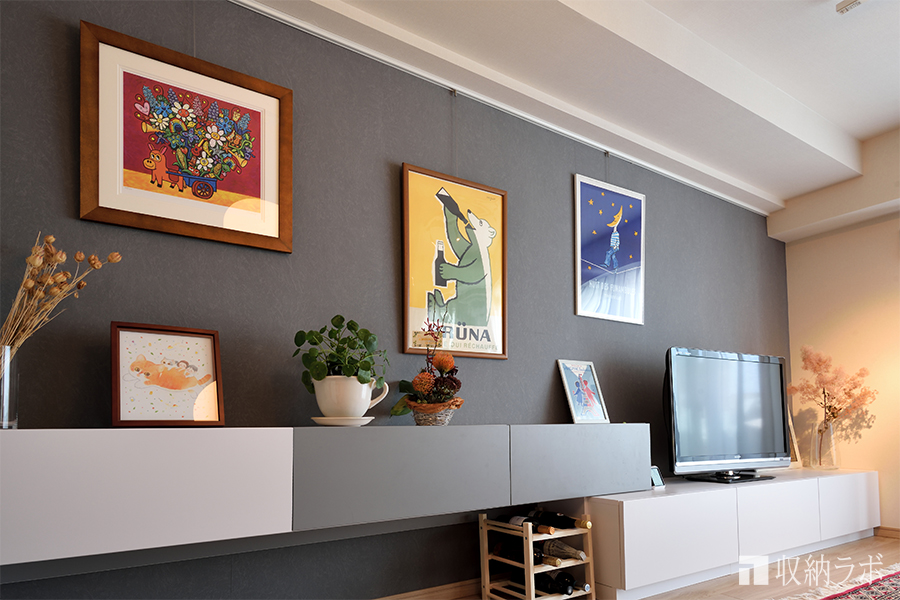 床から浮かせて設置した収納ボックスの下にはワインホルダーを置いたり、壁にはポスターを飾ったり、小物をディスプレイして、私たちなりにインテリアを工夫して楽しみながら暮らせるので楽しいです。また、集まって一緒に食事する友人達にも評判が良くてうれしいです。