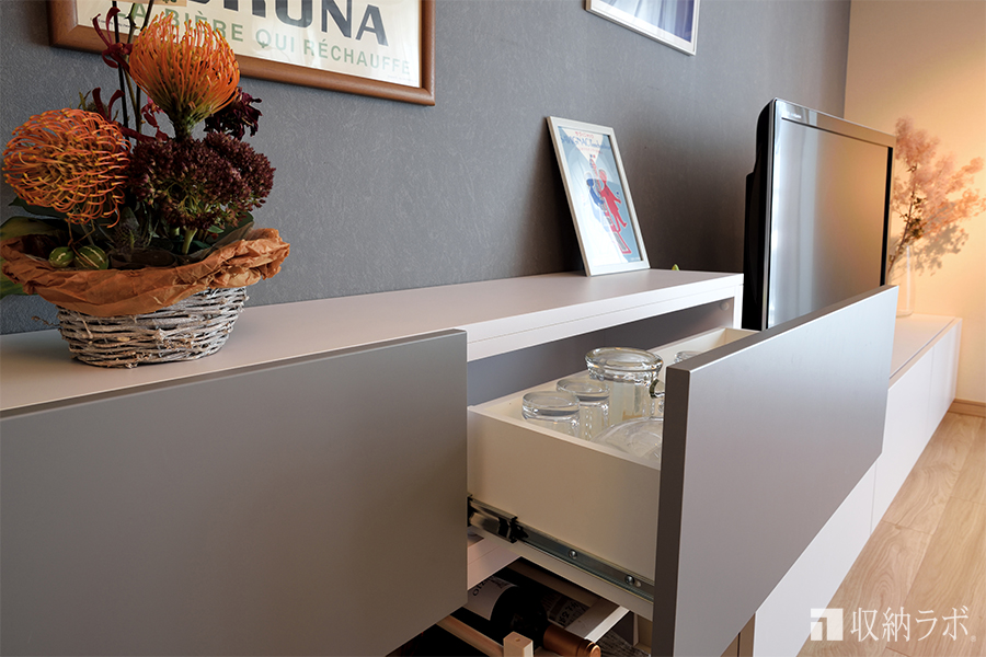 これなら、ダイニング収納として食器や小物が引き出しに収納できて、テレビの下には扉のついた収納ボックスにAV機器やパソコンなどを収納できるのでテレビボードとしても使えます。デザインもシンプルで、部屋もスッキリと片付けられるので、私たちにとって理想的なダイニング収納でした。