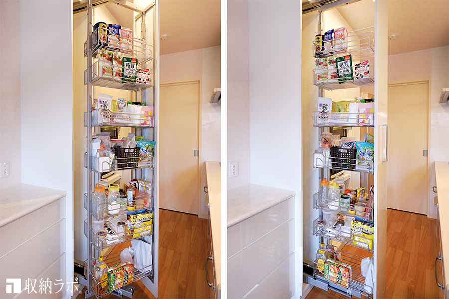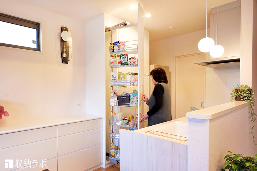 このパントリーは、引き出して使えるため、幅の狭い収納スペースを有効に使えることに加えて、左右に回転させることも出来るため、モノを探しやすく、出し入れもしやすく、使い勝手の良さは申し分ありません。天井いっぱいまでのデザインにしたことで、高い天井が強調され、開放感が感じられる空間になったことも気に入っています。