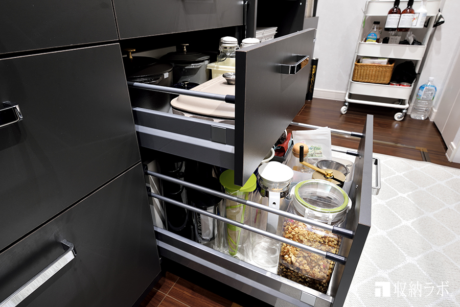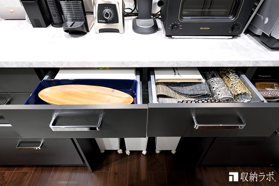 上段の収納ボックスや引き出しの中には、分類用のケースを使って整理整頓できる収納にしたかったので、収納スペースについては分類用のケースに合わせて、詳細にサイズを決めていきました。そのため、完成したすべての収納スペースが無駄なく活用できる上、どこに何が収納されているのか把握しやすいので、探し物が減ってストレスが減りました。