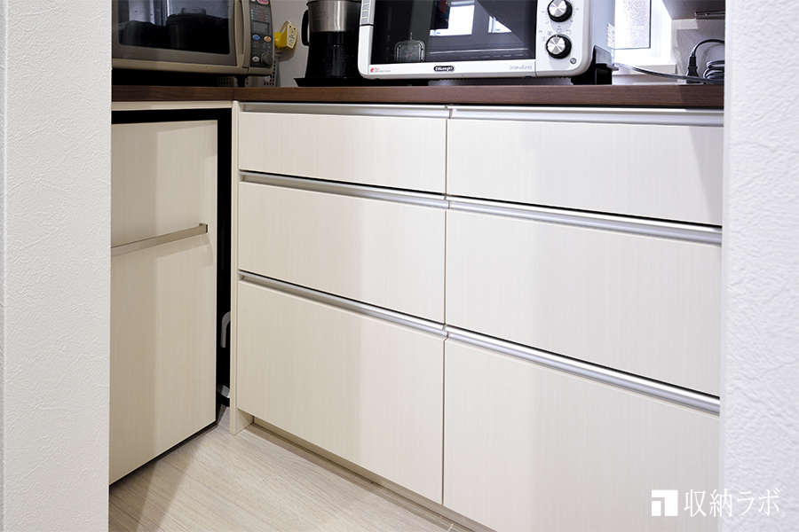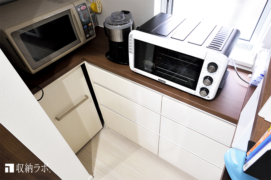 そのカウンターの上には調理家電が置けて、食器類などは引き出しに収納できるようになりました。