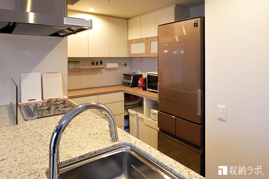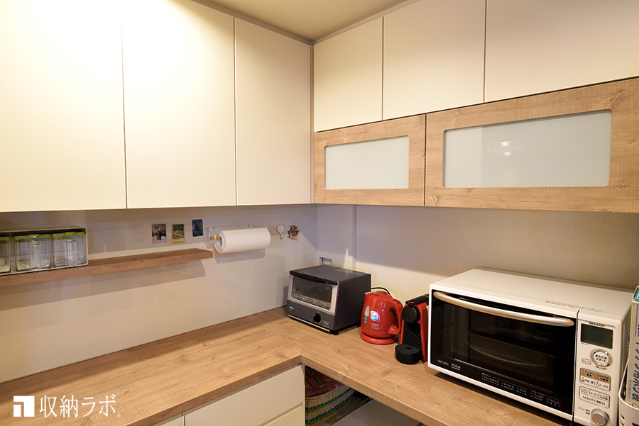 L字のカウンター天板は思っていた以上に広く、調理家電をゆったり置けて、カップなどの食器類を置くスペースも十分あります。また、L字のカウンターは調理中の食材や食器を体の横に置いておけるため、後ろを振り返ってものを取る頻度が減って使い勝手がとても良いです。