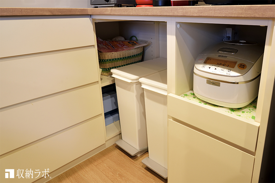 また、ゴミ箱の収納スペースはちょうどL字のコーナーになる部分を利用したため、ゴミ箱の横に棚板を設けて、ゴミ袋やキッチン周りの小物を収納するスペースにしました。キッチン周りで、散乱しがちなものをすっきり収納することが出来て重宝しています。