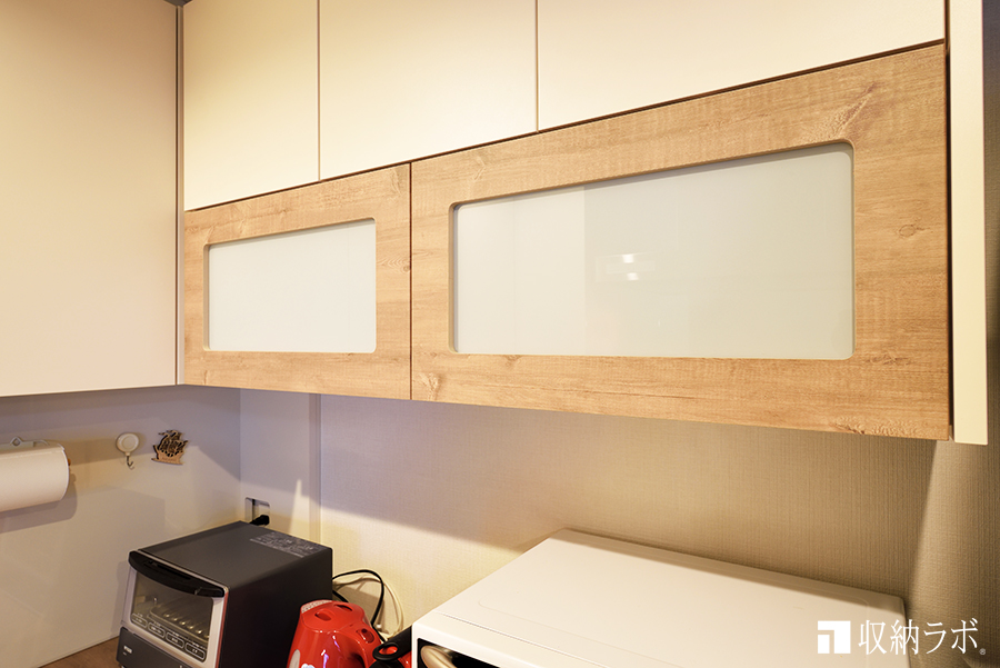 また、お茶用のカップやコーヒーや茶葉などは、一箇所にまとめて収納できるようにしたかったため、コーヒーメーカーや電気ポットを置くスペースの上に収納スペースを作りました。扉の開け方や扉のデザインも変えて食器棚全体のデザインのアクセントにもなっているので、気に入っているポイントです。