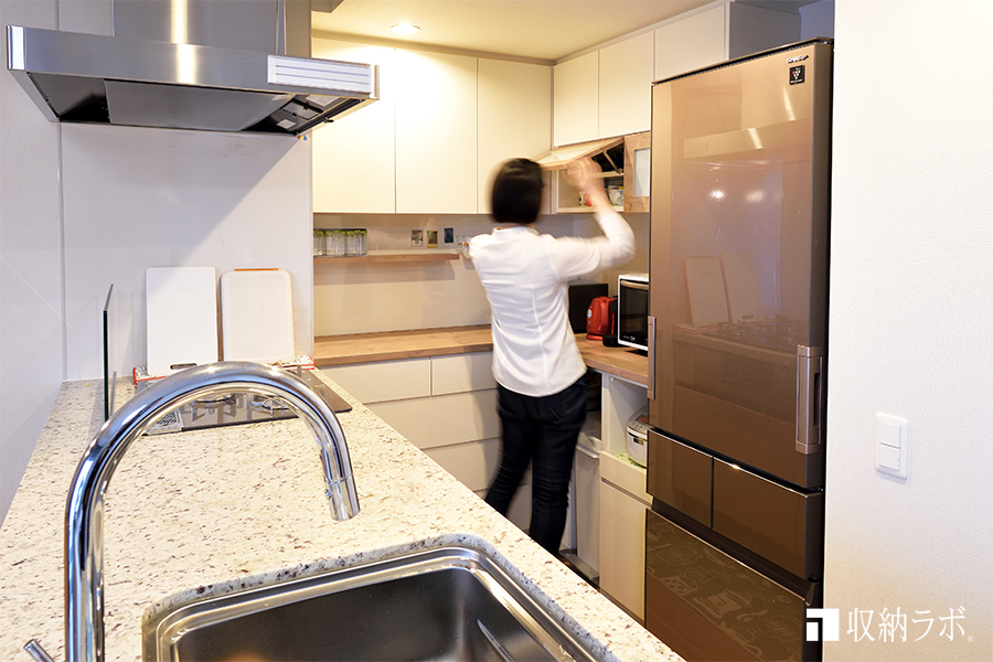 引っ越しを決めた新しいマンションのキッチンは、広くて気に入っていたのですが、今まで使っていた食器棚ではサイズが合いませんでした。せっかく余裕のあるスペースだから有効に使えるように、キッチンの奥と背面の両方の壁面が使える、L字の食器棚が置けたら便利だろうと思ったのですが、既製品ではイメージに合う食器棚が見つかりませんでした。そこで食器棚をオーダーメイドできる会社を探していて、収納ラボのことを知りました。