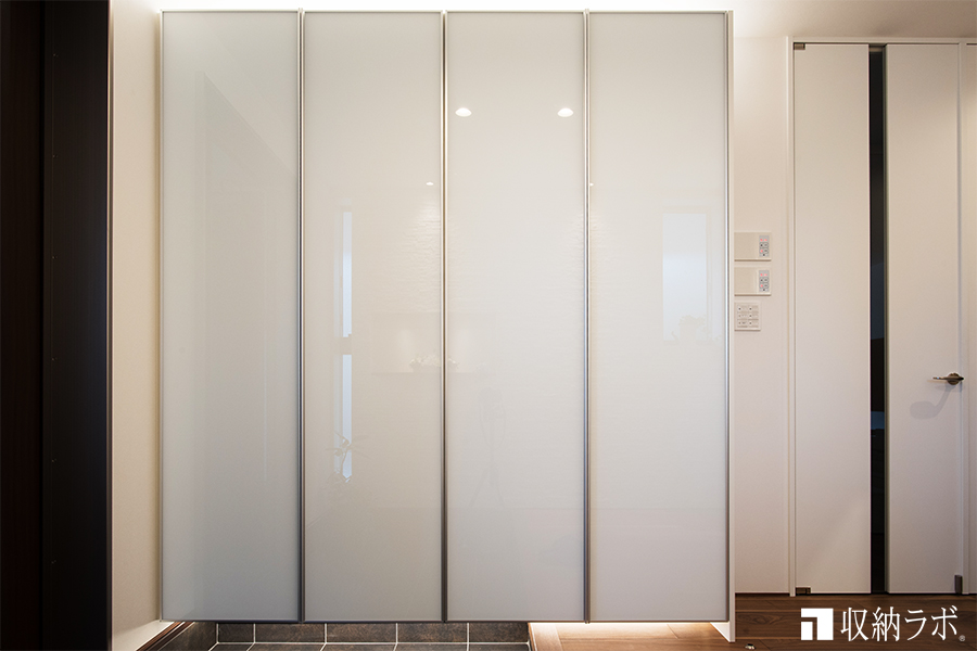 【マイホームのインテリアをガラス素材で統一するためにプランしたオーダーメイドの玄関収納。】