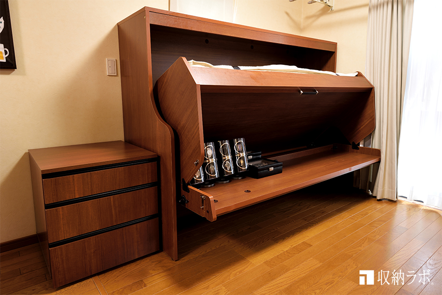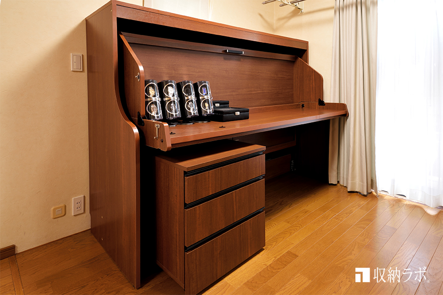 収納ベッドの天板には普段、コレクションの腕時計を飾ったりするつもりだったので、そうした腕時計のコレクションやちょっとしたものを収納できるように、収納ベットと同じ印象になるサイドキャビネットも一緒にオーダーすることにしました。