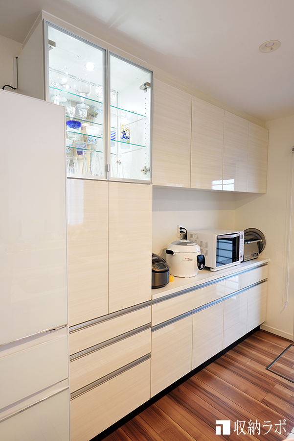 新しくなった食器棚では、子供が勝手に食器を出せないため、食器を並べて遊ぶことは出来なくなったので気が楽になりました。既存のキッチン収納と同じ素材を使ったことで一体感があって、もともと食器棚付のキッチン収納だったと思えるほどの仕上がりに大満足です。