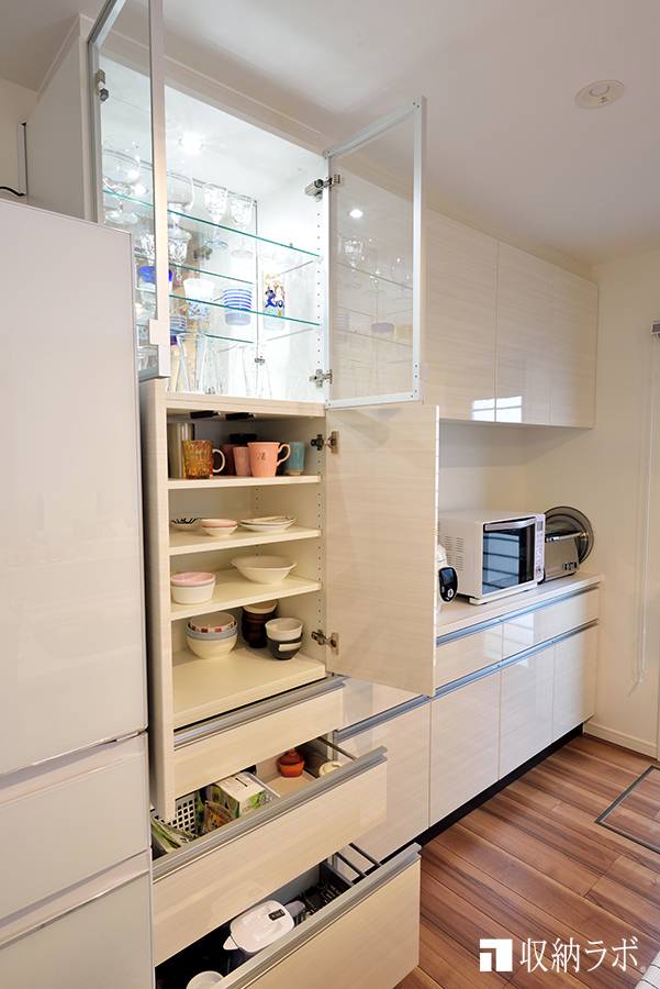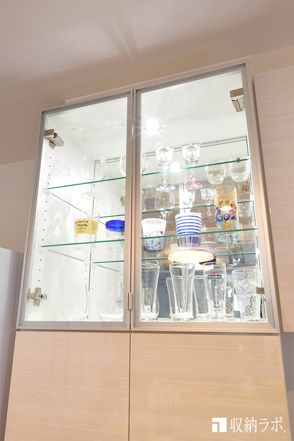 また、ショールームにある展示家具を見ているうちに、背面が鏡になった飾り棚がキレイだったため、食器棚の一番上にはお気に入りのグラスを飾りながら収納できる飾り棚を設計していただきました。照明もつけて、まるでディスプレイ用のショーケースのような仕上がりにとても満足しています。