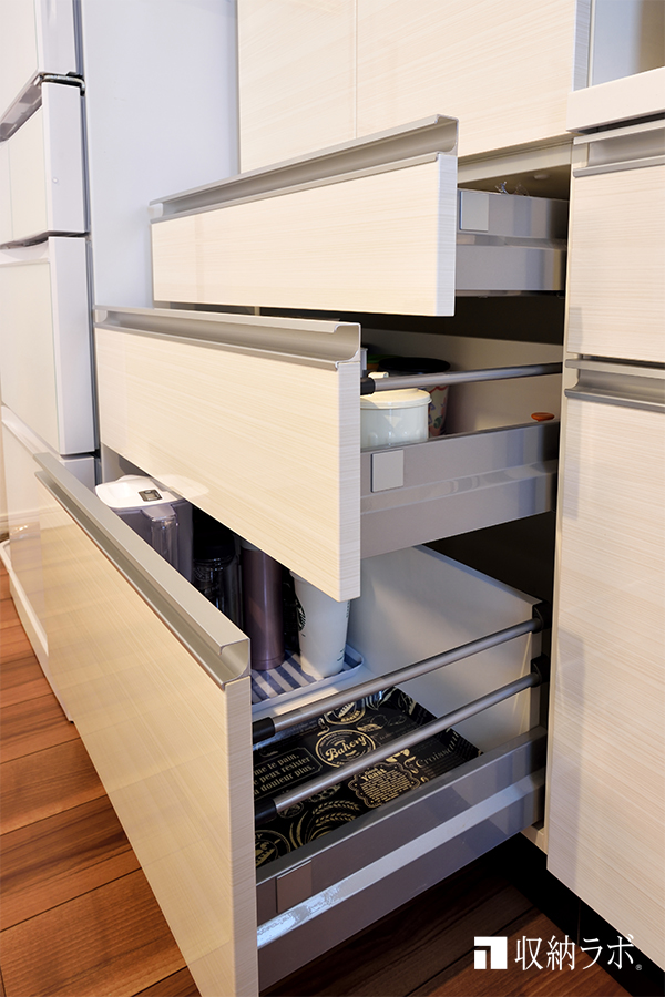 ショールームでは子供が一人で食器を取り出せないようしたいことや、キッチンの収納を改善したいという、私たちの要望をコーディネーターの方に伝えると、既存のキッチン収納と冷蔵庫の間に食器棚を作る事を提案していただきました。既存のキッチン収納との統一感を気にしていたのですが、食器棚の扉や引き出しの面材と取手は、既存のキッチン収納のメーカーが使っているものと同じ素材を使えることがわかったので、その素材を使うことにしました。