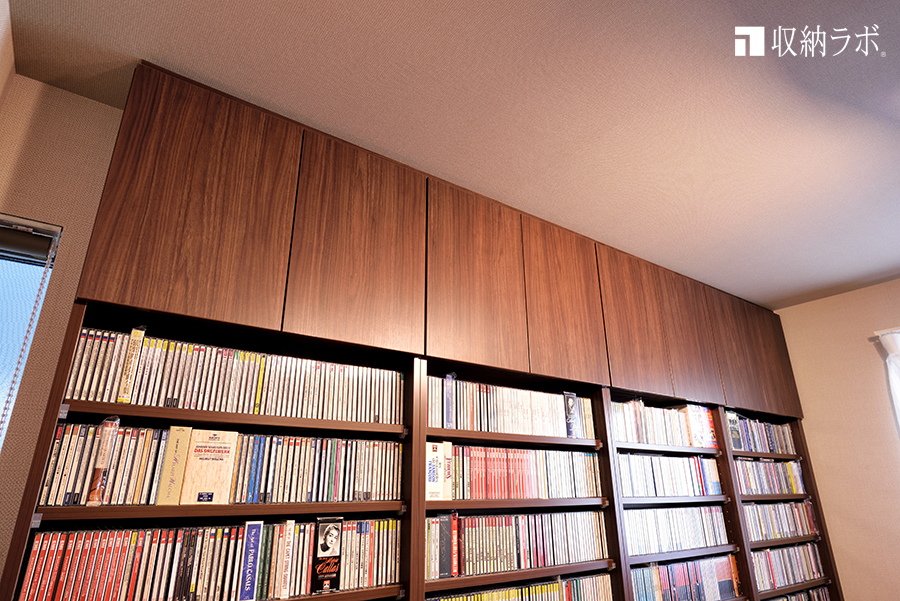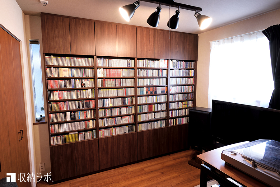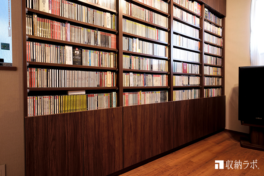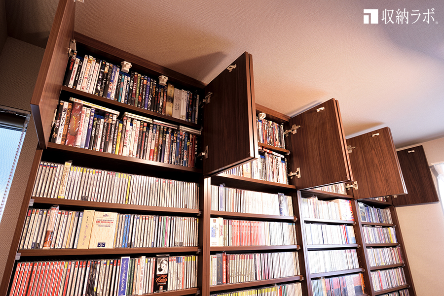書斎に作った大量のCDとDVDを安全に収納できるオーダーメイドの壁面収納。