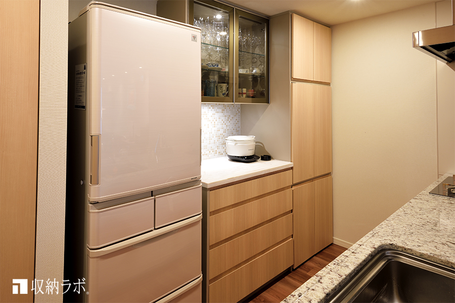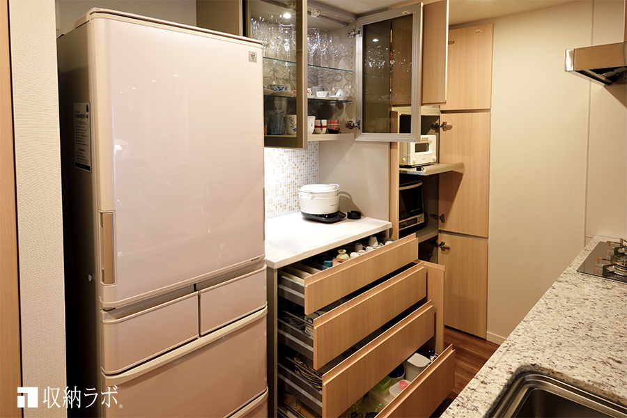 お客さまは、食器棚についてガラス製の食器は見せて収納、日常的に使う食器類や重たい大きなものは引き出しに収納して、調理家電やゴミ箱は隠す収納にしたいという具体的なご要望をお持ちでしたので、機能面とデザイン面の両方に配慮したご提案を心がけました。食器棚の機能面としては、調理家電の収納スペースにつける扉は、片方だけ収納扉にすることをお勧めしました。収納扉は、扉を垂直に格納するため、収納スペースの内側が狭くなるので、収納スペースを確保するために動線を塞ぐ側だけ収納扉にしました。