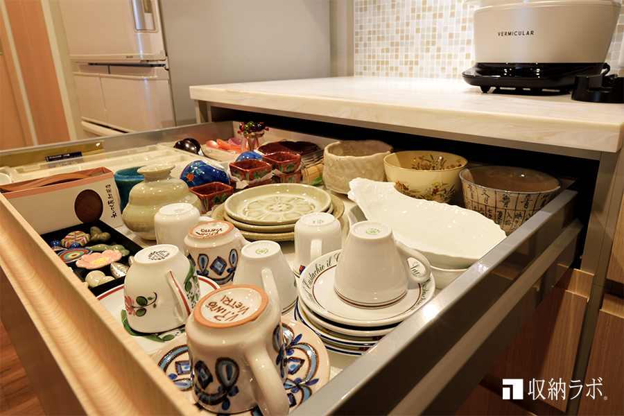 食器棚をオーダーメイドするにあたって、食器類を引き出しに収納したいと考えていたので、持っている食器のサイズに合わせて切った紙を用意して、引き出しに食器がすべて並べられるか確認しながらサイズを決めていきました。こうして、食器の種類や用途に合わせて分類しながら収納できる引き出しを作ることができました。