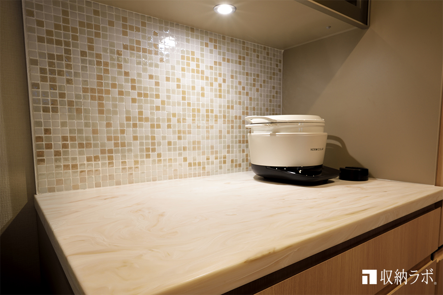 また、食器棚のカウンターの天板はものはなるべく置かずに、家事をするスペースとして活用するために広めにしました。また、食器棚の背面にはこだわって選んだモザイクタイルを貼りました。さまざまなメーカーのタイルを比較検討して、最終的にはベージュを基調としたデザインのタイルに決めました。扉の面材の木目や、スモークガラスの色合いとも似合っているので気に入っています。
