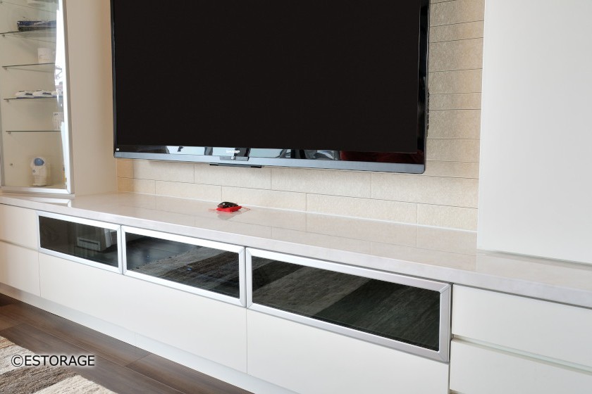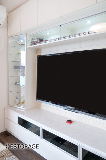 タイルと照明がアクセントの白いオーダーメイドの壁面収納
