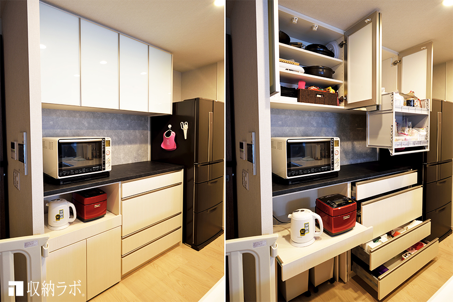 収納グッズが使えるようにサイズを調整した引き出しやゴミ箱収納、調理家電用のスライド棚など、それぞれの要素が家事を快適にするための動線になるように、食器棚全体のバランスについても配慮しました。