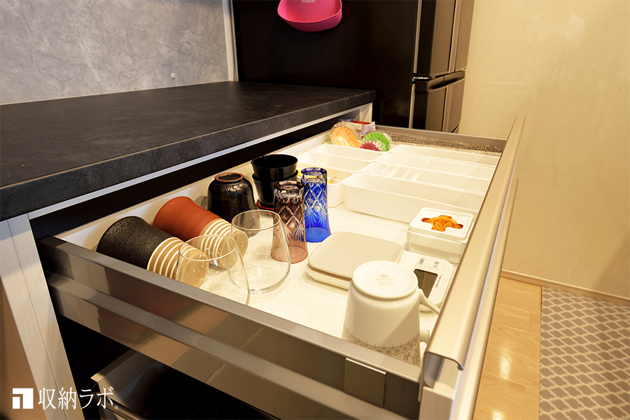 また、食器棚の引き出しには、食器を収納したいと考えていました。サイズや形に合わせて、食器を引き出しの中に収納するために、想定していた整理グッズが入る引き出しを設計していただきました。食器のサイズや形状に合わせて分類できるようになって、欲しい食器が探しやすく片付けもしやすい上、静かに食器の出し入れが出来るようになったので、子供が寝ている時の家事が気にならなくなりました。
