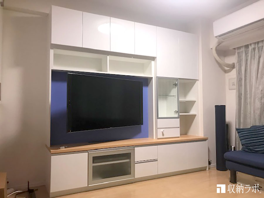 以前のリビング収納の天板はウッドタイプのデザインでしたが、新居のキッチンの天板に合わせて、壁面収納の天板の色を変更しました。移設させた家具の一部を変更できるのも収納ラボのオーダー家具の特徴です。