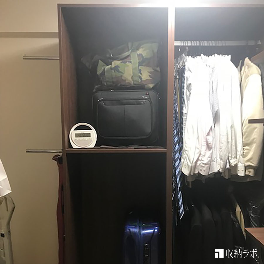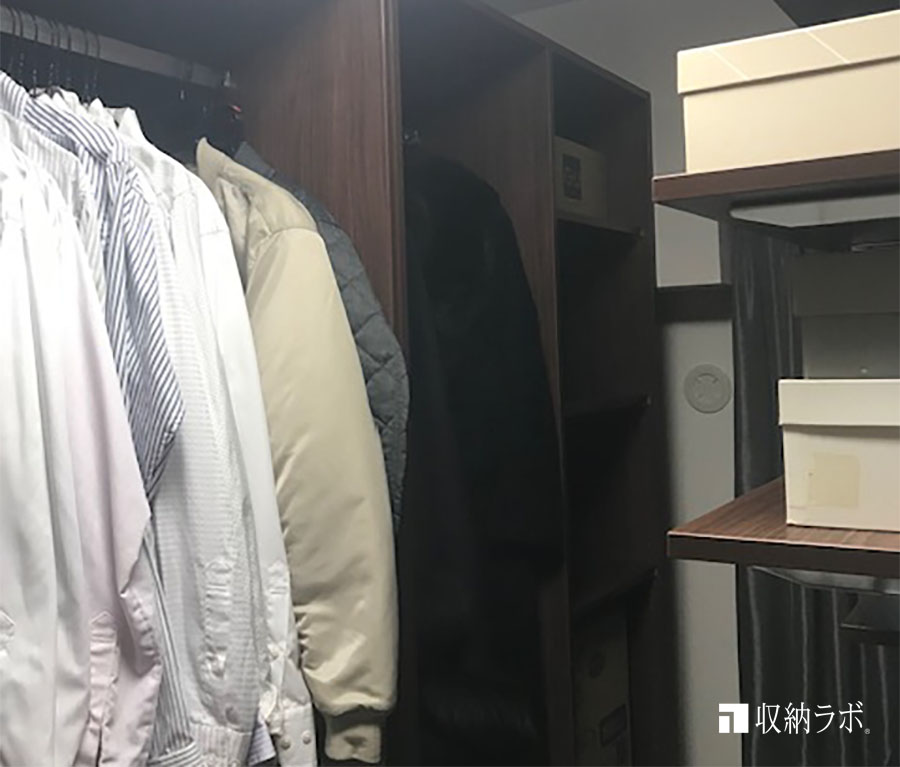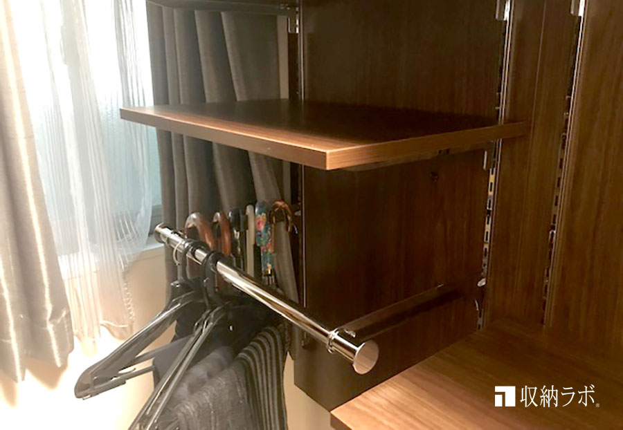 ご主人の洋服や趣味のゴルフ用品などを入れために設計された収納棚。