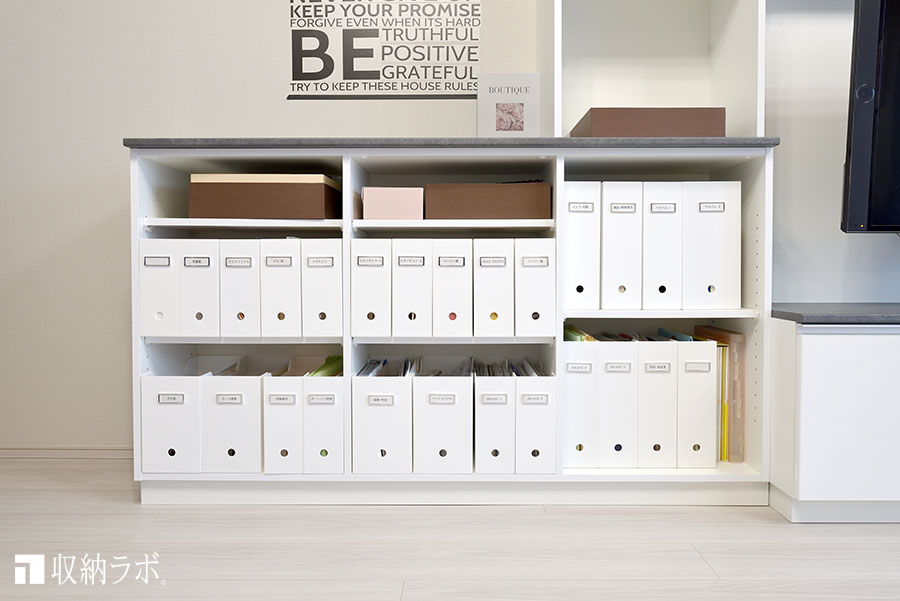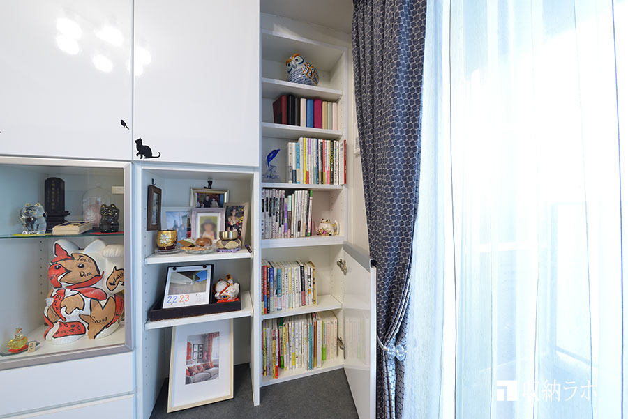 左側は、書類や資料などの実用品を収納。