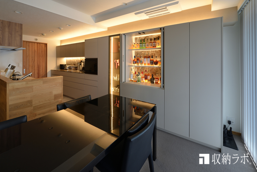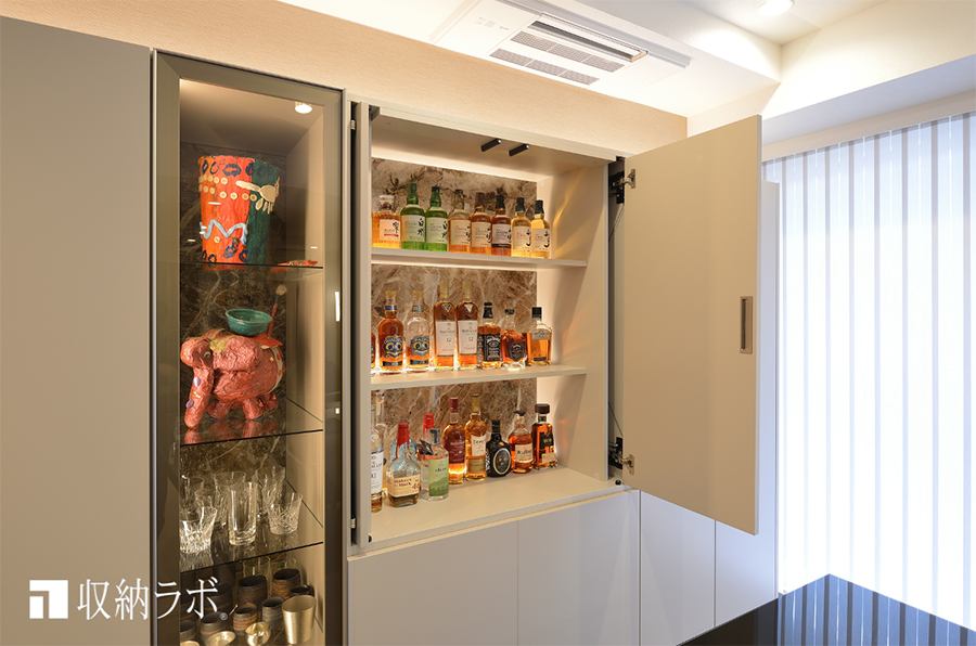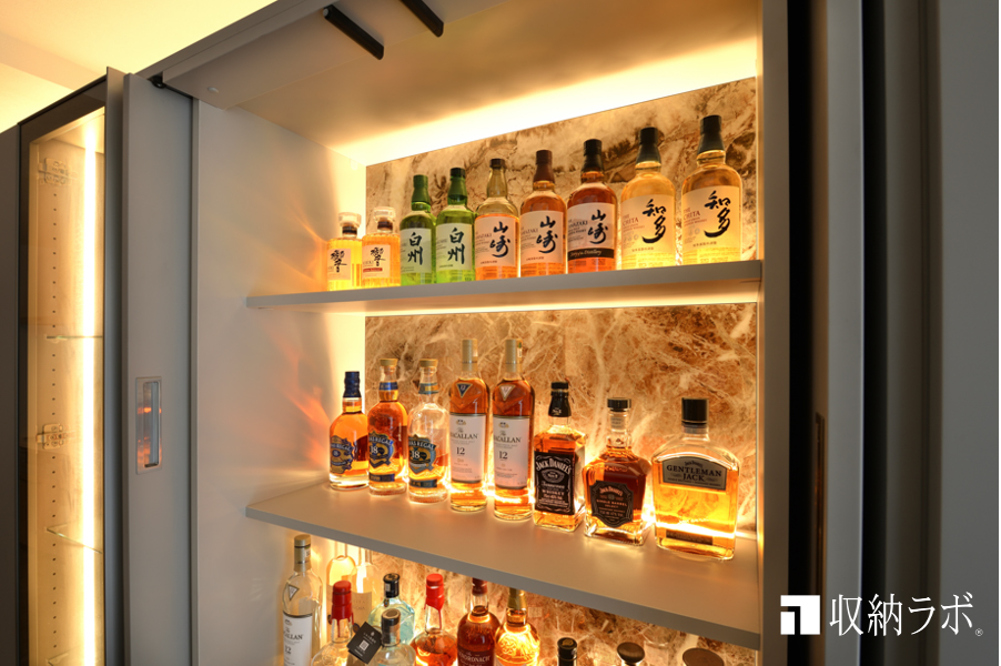 お客様の理想を叶えるために、照明デザインや家具の色彩と素材感、そして収納するものを美しく見せるレイアウトにこだわりデザイン・製作しました。