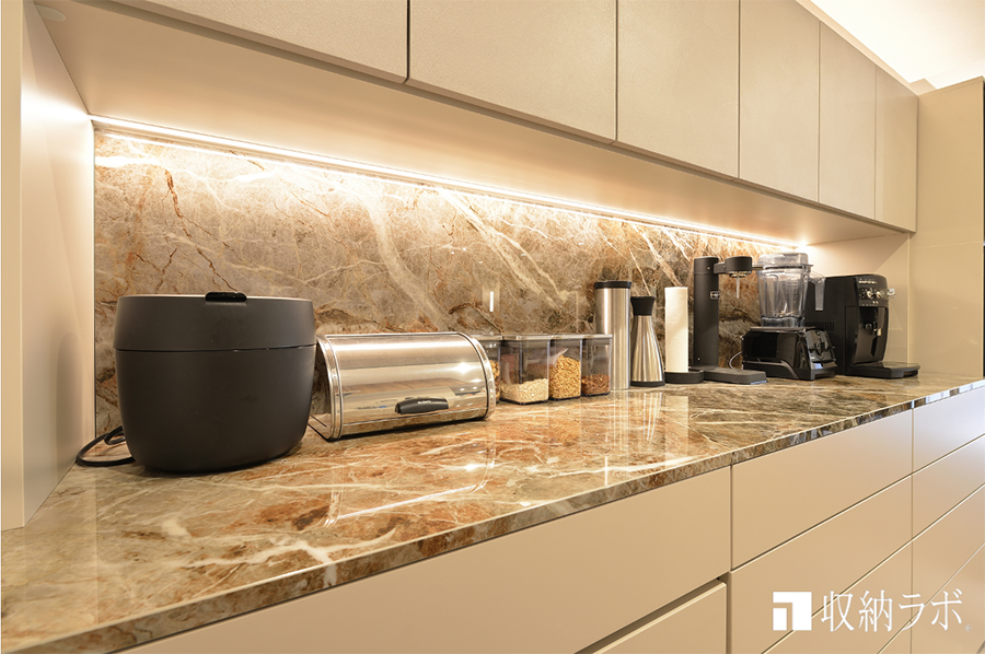 キッチン収納の背面と天板には、大判の大理石調セラミックタイルを採用しています。