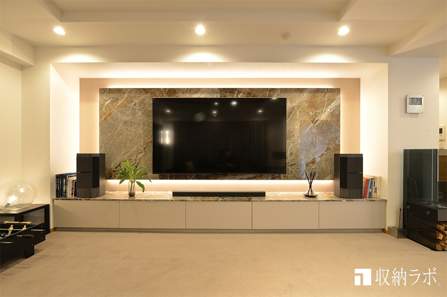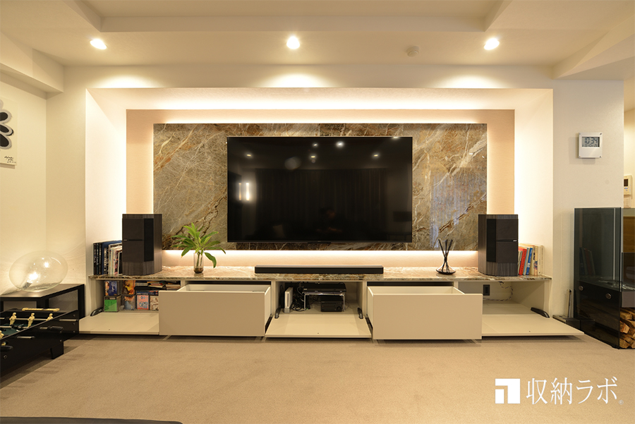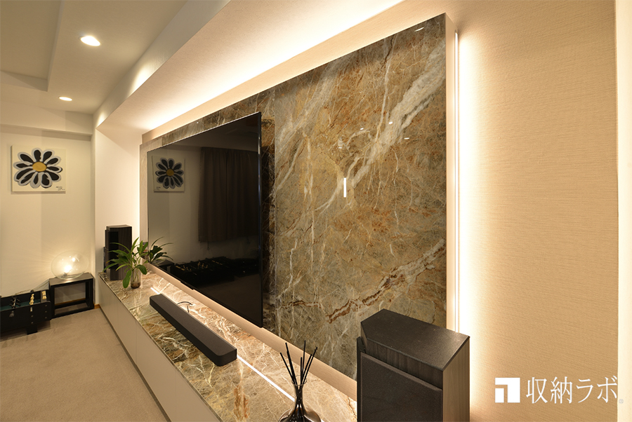 テレビの背面から天板にかけて、大判の大理石調セラミックタイルをあしらいました。