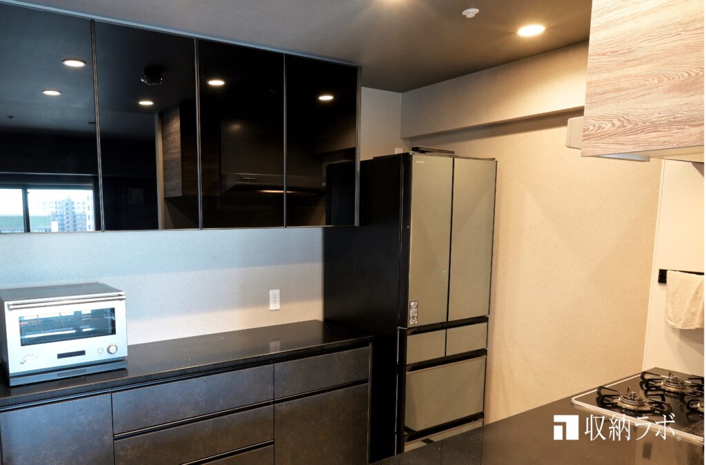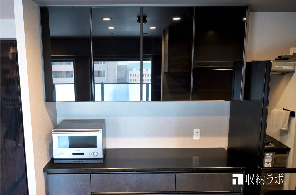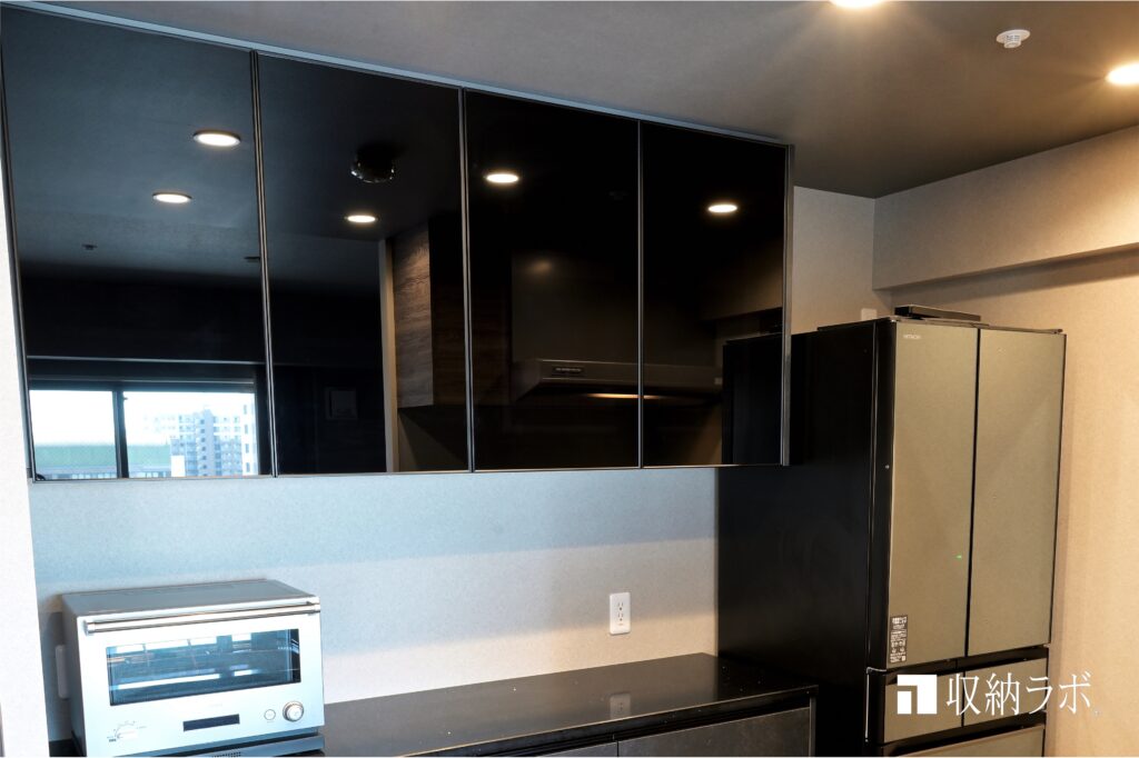 上部の吊り戸棚にはブラックのスモークガラスを採用。中身をしっかりと隠しつつ、スタイリッシュなキッチンを実現しました。