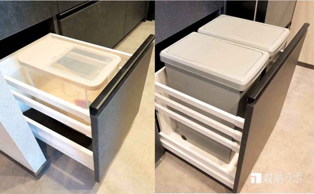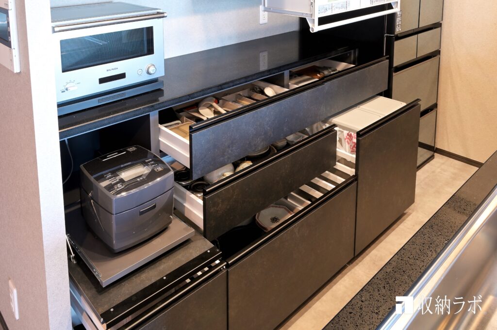 炊飯器はスライド式を採用。もっとも生活感が出やすいゴミ箱や米櫃は引き出しの中に収納しました。必要なときに引き出せるように設計することで、機能面でも優れています。