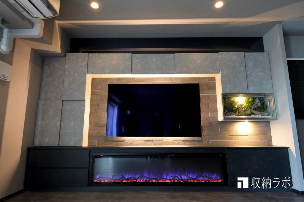 テレビ右横のアクアテラリウム風のディスプレイもお客様のこだわりのひとつ。インスタグラムで見つけたお好みのディスプレイをイメージ通りに再現することができました。水槽のなかには本物の流木などを配置し、リアリティのある世界を演出しています。