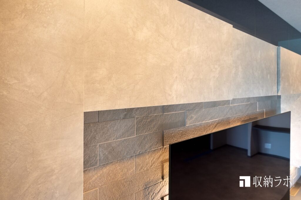 扉を閉めた際には上下左右にあえて凹凸のあるデザインを採用。テレビ背面へ施したエコカラットの凹凸感と合わせることで、壁面全体に統一感と奥行きを持たせています。